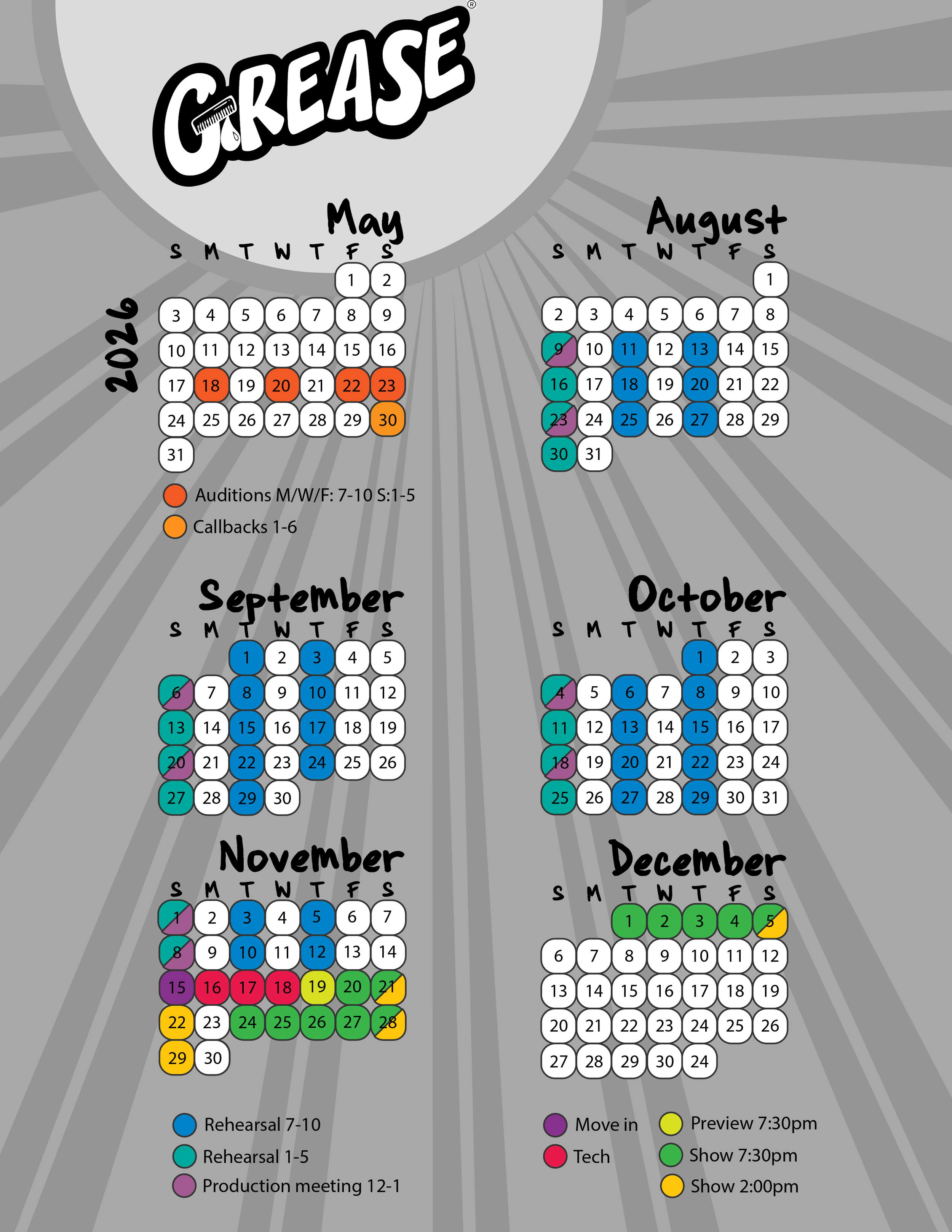 Only the Directors, Choreographer, Music Director, Producer and Stage Manager are required to attend auditions and callbacks. Assistant Stage Managers will be asked to help out as greeters alternating audition days.